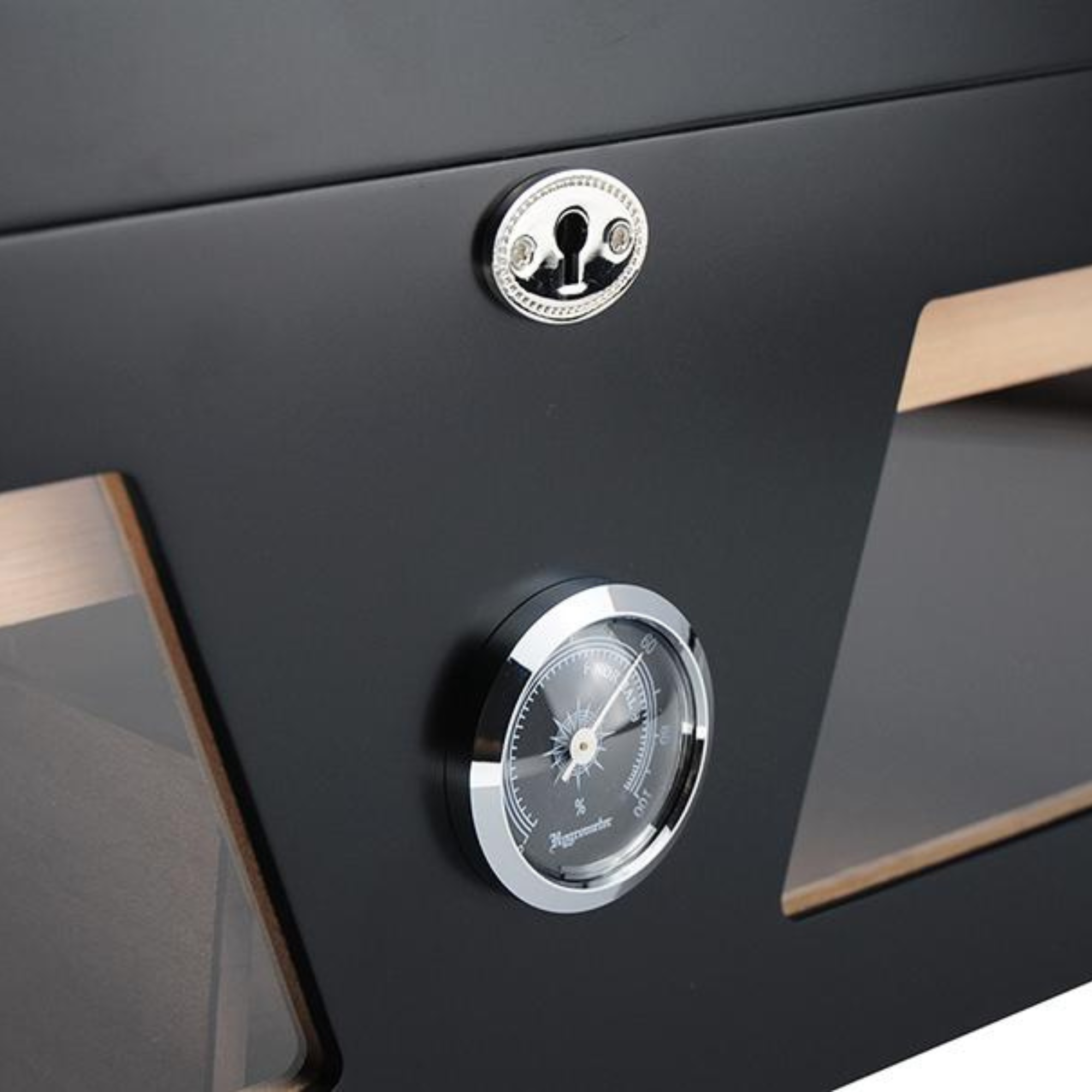 Made with Spanish Cedar and has a matte black finish, it also includes a humidifier and hygrometer. This cigar box can store up to 100 cigars, with a glass top and glass window on the front for easy viewing.