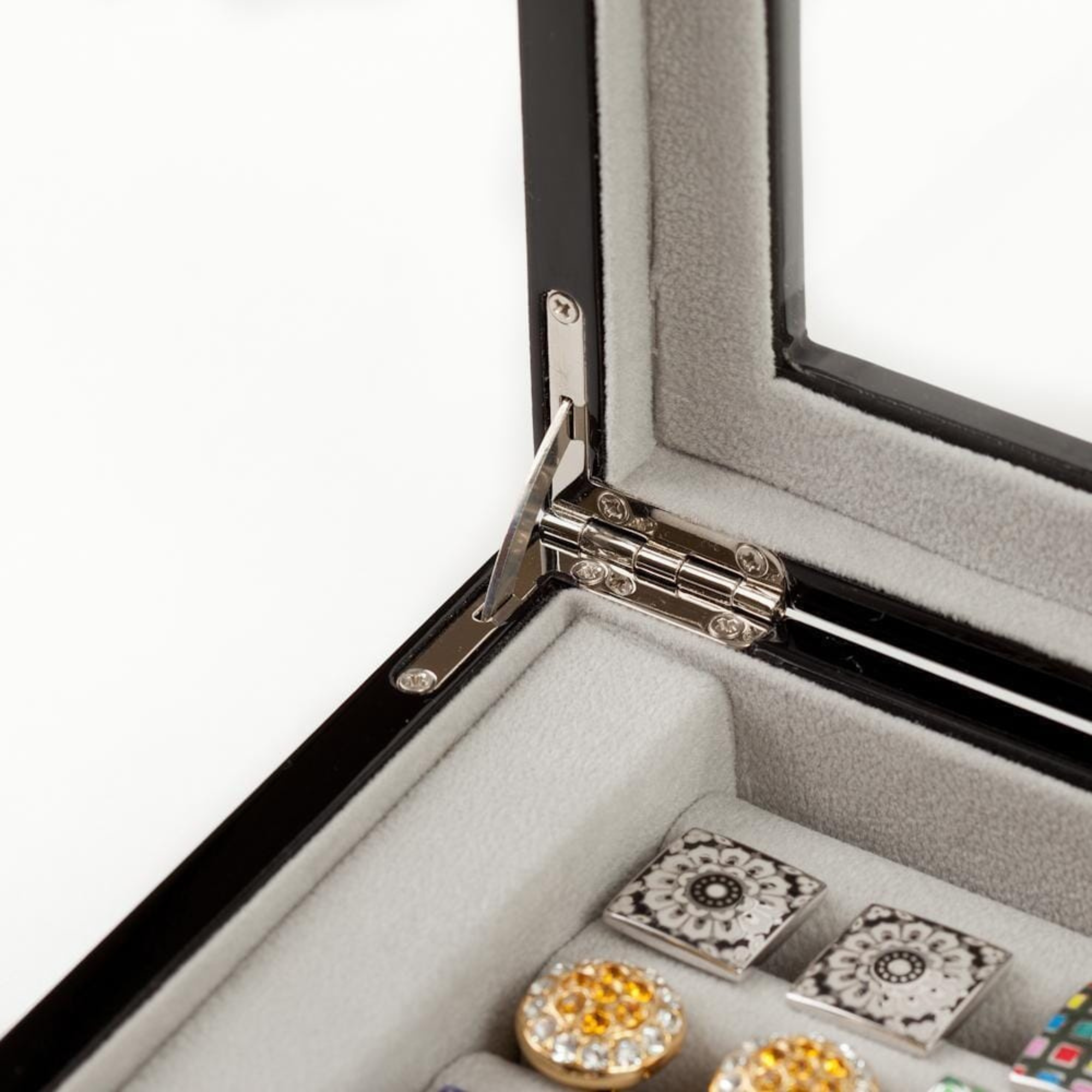 If your cufflinks are scattered all over the house, or just want a great way to display your cufflink collection, you've found the perfect cufflink box. This black wooden cufflink box features a velvet interior and a clear acrylic shatter-proof lid to keep your cufflinks dust free.