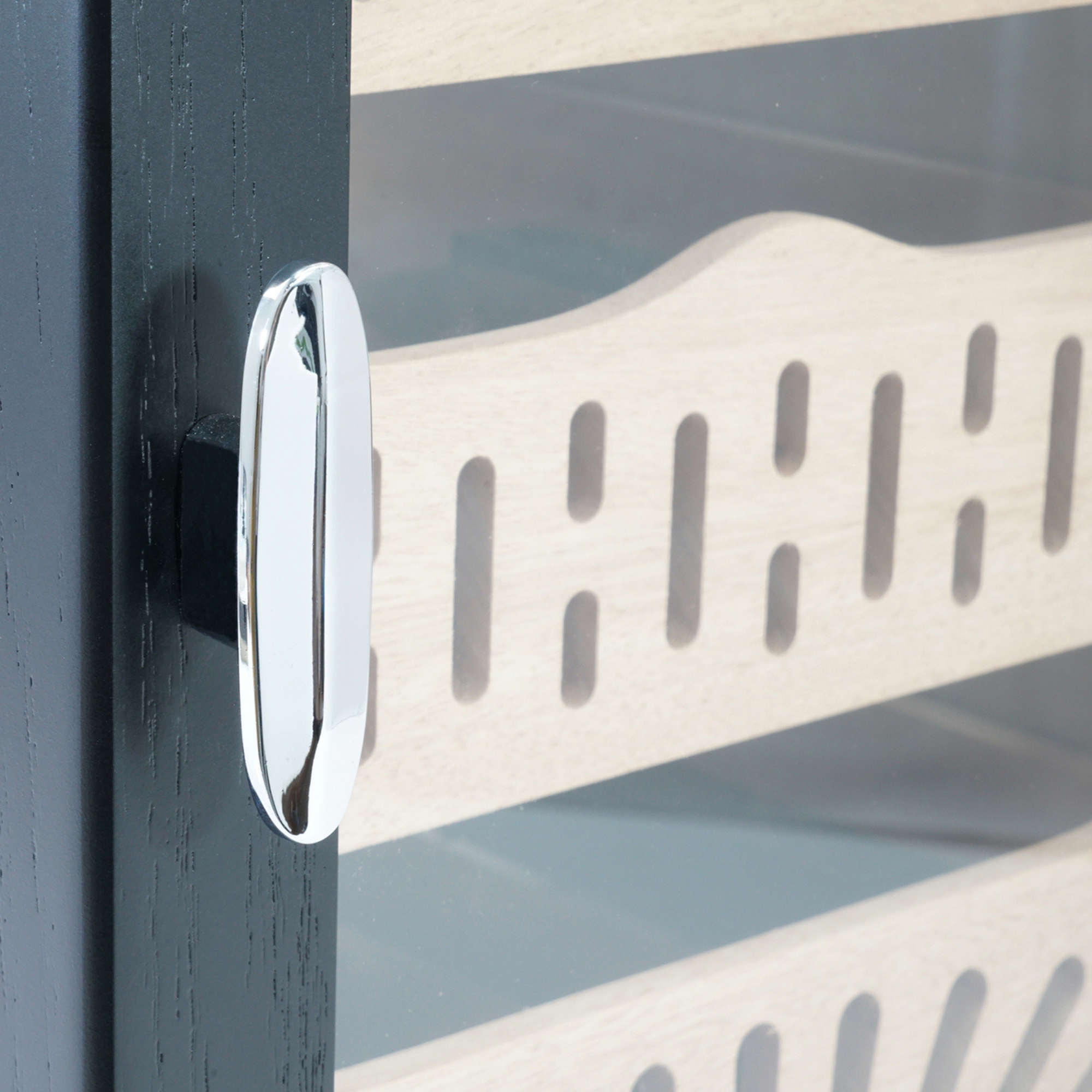 Quick same-day dispatchKeep your cigars in perfect condition with this elegant 200 Count Black Wooden Cigar Cabinet. Crafted with a sleek black exterior and a clear glass top and door, it beautifully showcases your collection while maintaining ideal humidity. The rich mahogany lining enhances aroma and aging, complemented by multiple removable drawers and a built-in hygrometer for precise control. A must-have for cigar enthusiasts who appreciate refined craftsmanship and timeless style.